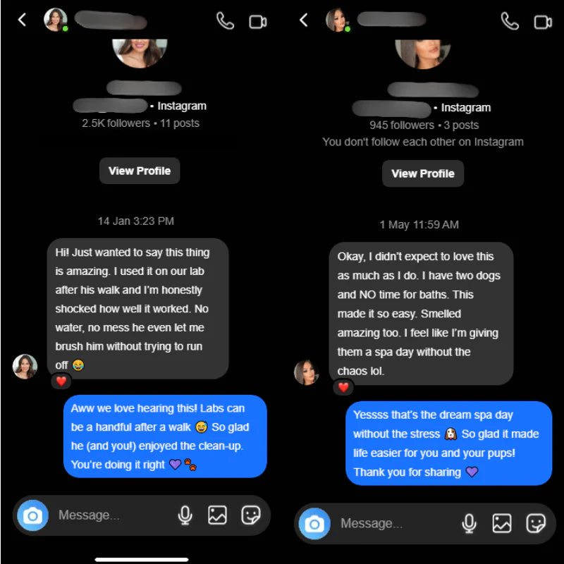 Our grooming solution is designed to address all these common problems making it easier to manage tangled fur, reduce mess, and keep your pet clean and comfortable without the stress of frequent baths.